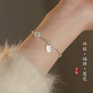 新中式精工珍珠莲花手链女轻奢风碎银子福牌时尚百搭个性显白手串