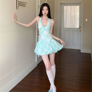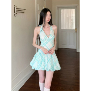 格纹薄荷绿V领挂脖短裙连衣裙夏季海滩度假风收腰花苞蓬蓬裙子女