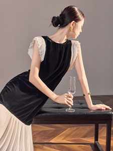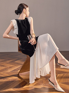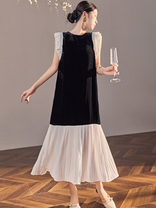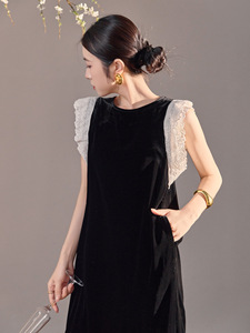 国风桑蚕丝飞飞袖百搭丝绒长裙女装新中式高级拼接连衣裙 N6076