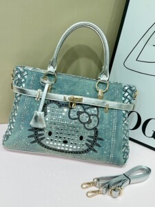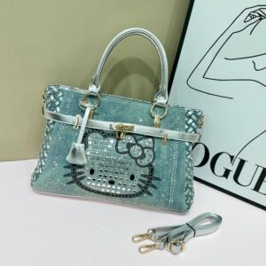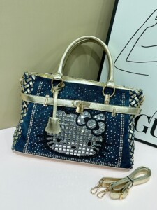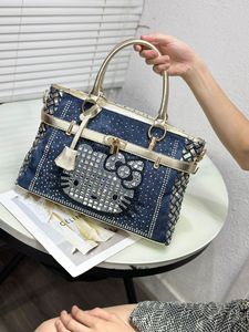 跨境专供时尚手提包编织牛仔包镶钻帆布包单肩斜挎包KT猫铂金包