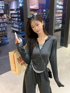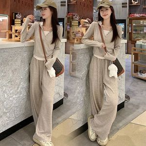 糯米套装两件套休闲运动套装假两件长袖上衣女秋季高腰长裤阔腿裤