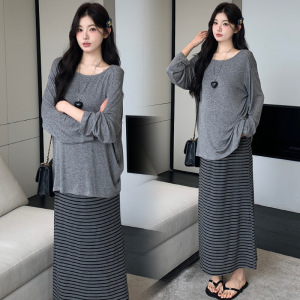 孕妇装早秋新款慵懒风宽松两穿上衣+条纹半身裙甜美休闲孕妇套装