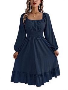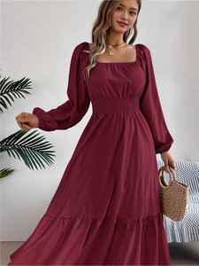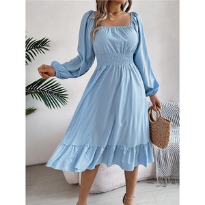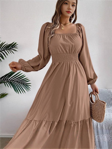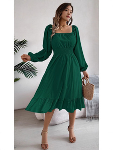 跨境亚马逊女装新款泡泡袖方领大摆连衣裙欧美