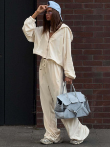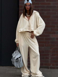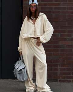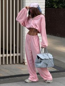 跨境欧美2025秋装新款宽松连帽短款卫衣两件套女装高级感简约套装