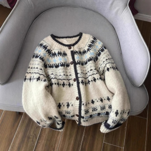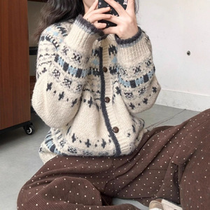 日韩圆领复古撞色提花软糯毛衣女秋冬新款宽松慵懒风温柔针织开衫