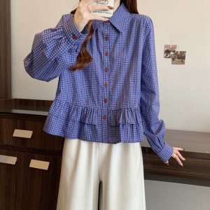 蓝色格子衬衫女装2025早春秋新款宽松显瘦甜美娃娃衫