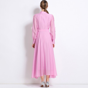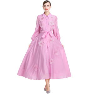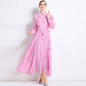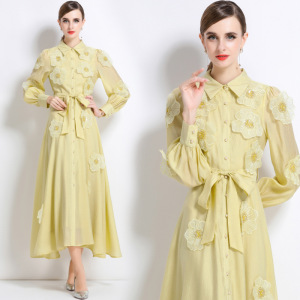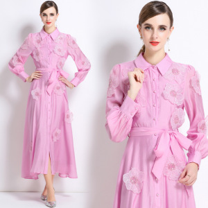 欧美跨境女装法式翻领刺绣贴花连衣裙气质长袖收腰A字长裙
