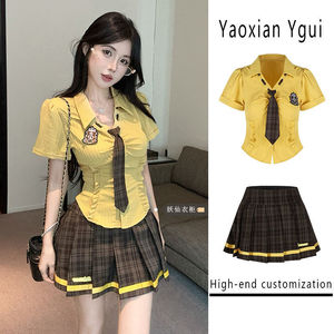 学院风POLO领木耳边衬衫套装女夏季高腰半身裙小众设计感短袖上衣