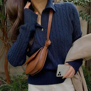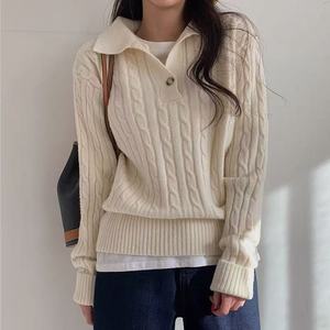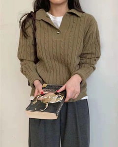 韩国chic秋冬复古洋气翻领麻花纹设计宽松休闲百搭长袖针织衫毛衣