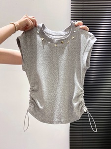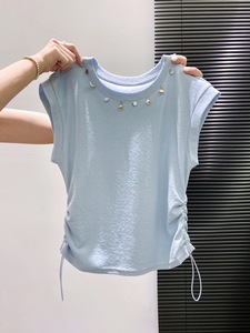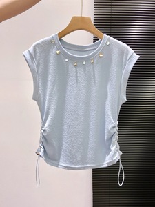 钉珠圆领短袖t恤女2025新款抽皱收腰显瘦短款夏日别致绝美小上衣