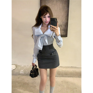 高级感条纹小众长袖衬衫蝴蝶结高腰显瘦半身裙女春季新款时尚套装