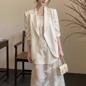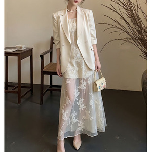 法式设计感穿搭今年超火春装小香风白色西装外套吊带连衣裙套装女