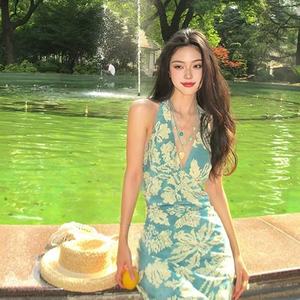 明星同款孔雀蓝领碎花挂脖吊带连衣裙女夏法式度假风露背气质长裙