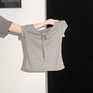 美式浅灰色V领蝴蝶结系带短袖T恤女夏季2025新款修身显瘦辣妹上衣