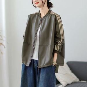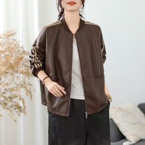 25年秋款皮衣外套女长袖拼条宽松休闲韩版外套学院风上衣立领时尚