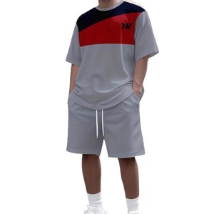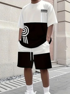 跨境TEMU夏季渐变字母3D数码印花T恤短裤套装男士潮流图案两件装
