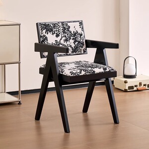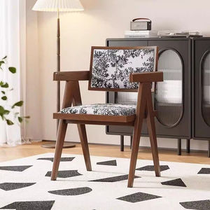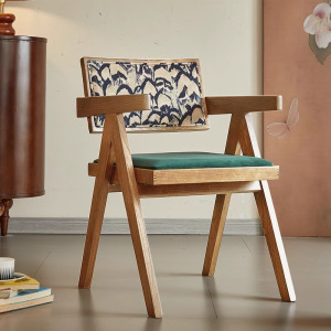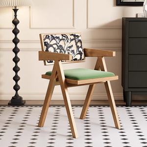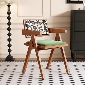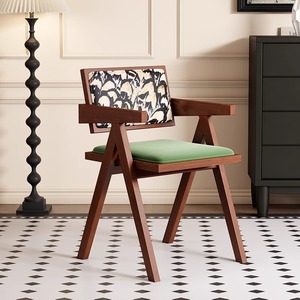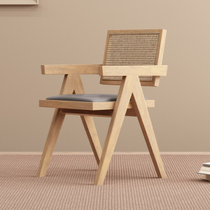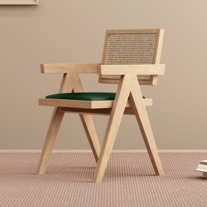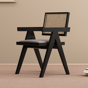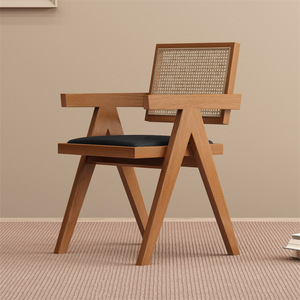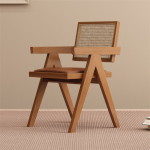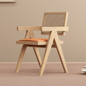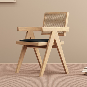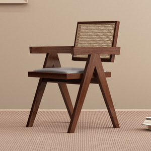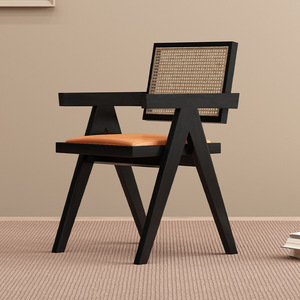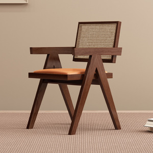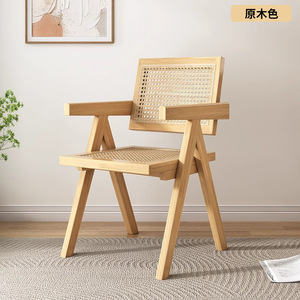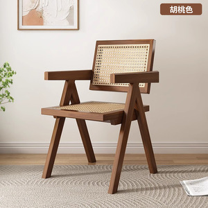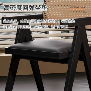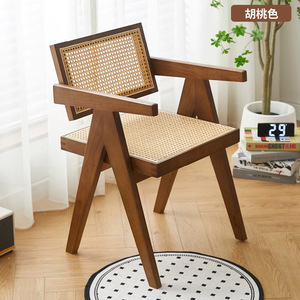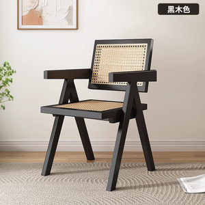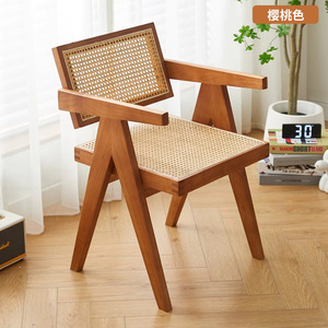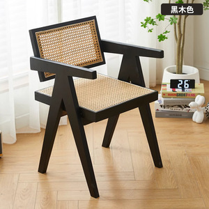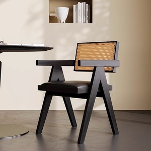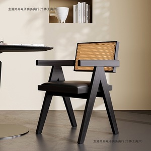 实木餐椅家用中古风昌迪加尔椅侘寂风软包扶手靠背椅休闲藤编椅子