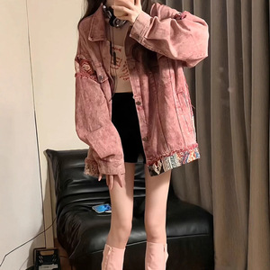美式复古拼接牛仔外套女春秋宽松设计感小众休闲百搭粉色工装上衣