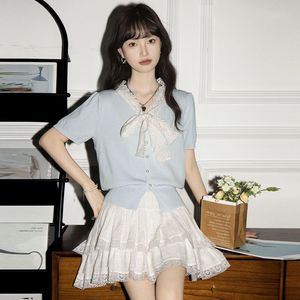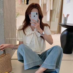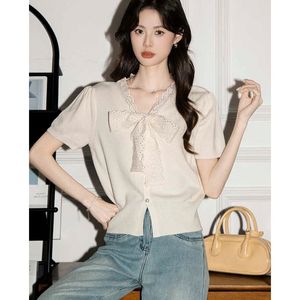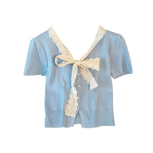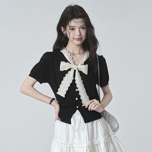小香风蕾丝蝴蝶结系带短袖针织开衫女夏季收腰显瘦独特漂亮上衣薄