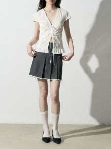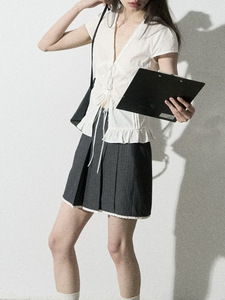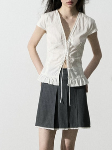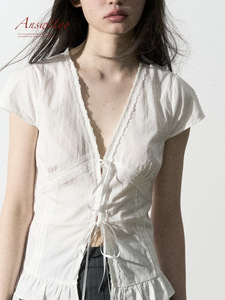 ANSWLLYO原创设计蕾丝花边纯欲肌理白衬衫修身系带蝴蝶结短袖上衣