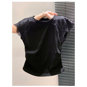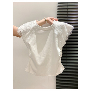 40支纯棉蕾丝拼接圆领短袖T恤女夏季爆款褶皱收腰小飞袖短款上衣
