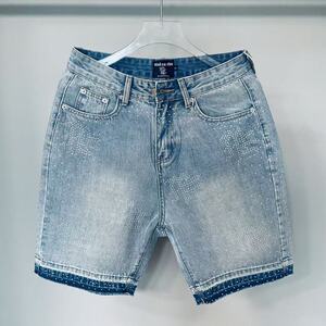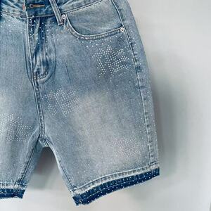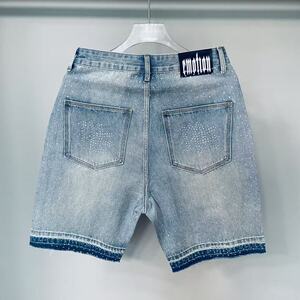 跨境MIXED EMOTION美潮高街水洗做旧烫钻宽松直筒休闲牛仔短裤男