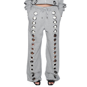 拉链连帽卫衣鸡眼设计套装欧美跨境潮流铁环镂空男女同款宽松开