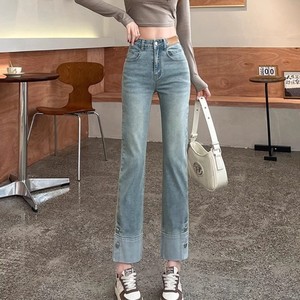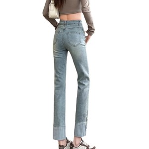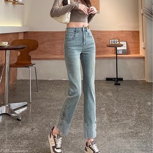 浅蓝色窄版烟管牛仔裤女时尚百搭高腰遮肉显瘦翻边九分法棍直筒裤