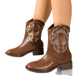外贸大码刺绣时装靴女中筒秋冬季新款尖头粗跟V口后拉链显瘦靴子