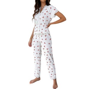 欧美跨境热销家居服樱桃印花短袖翻领睡衣女可外穿长裤两件套套装