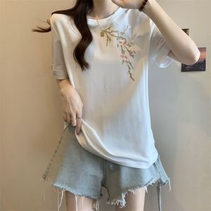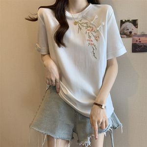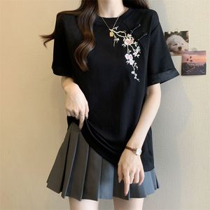 新中式国风桃花刺绣短袖T恤女2025夏季新款宽松显瘦胖mm大码上衣