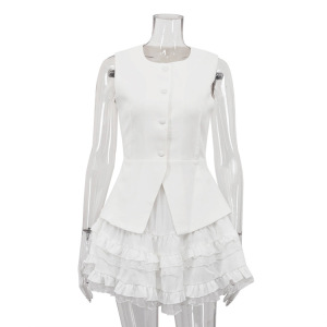 跨境休闲时尚短裙套装女高级感无袖背心马甲上衣高腰蓬蓬裙两件套