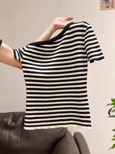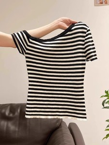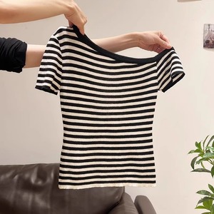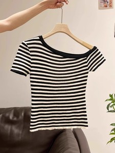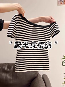 黑白条纹斜领露肩针织短袖t恤女2025夏季爆款修身显瘦独特小上衣