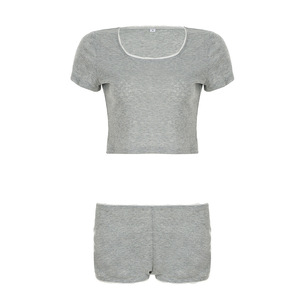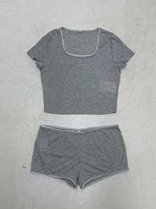 美式休闲家居服套装花边拼接基础圆领套头短袖上衣四角短裤两件套