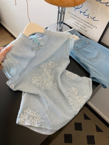 新中式国风盘扣重工亮片刺绣立领短袖衬衫气质女士设计感蓝色上衣