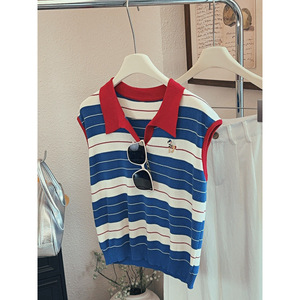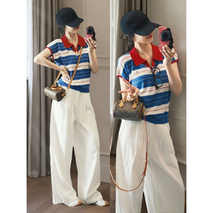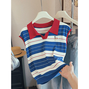 撞色条纹领针织冰丝小飞袖短款上衣女夏季小个子正肩短袖恤