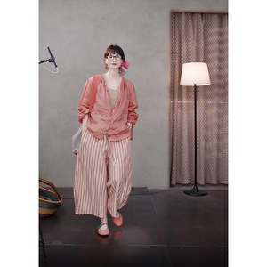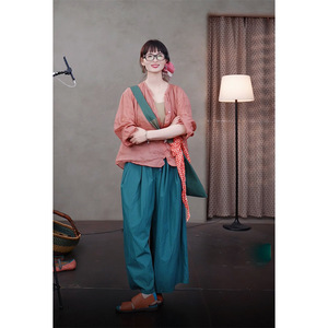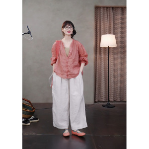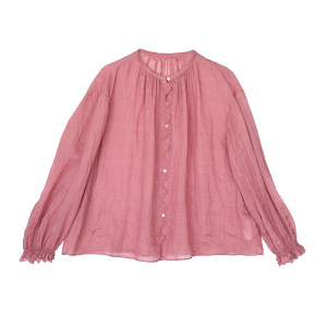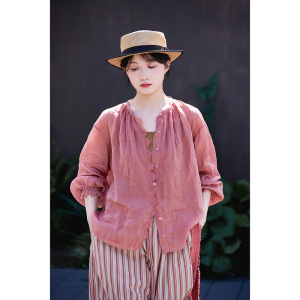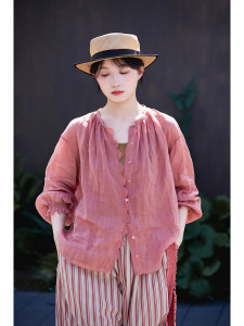 秋季新款文艺复古原创玫瑰粉苎麻轻薄透气凉感休闲立领防晒衬衫女
