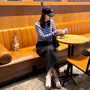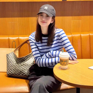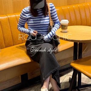 法国rouje chic法式百搭休闲风蓝色条纹修身显瘦T恤女春长袖上衣