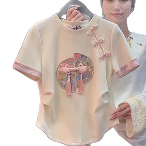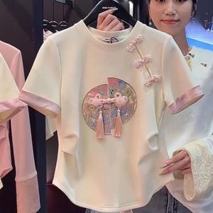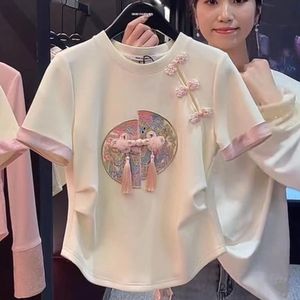 大码新中式国风重工刺绣盘扣短袖t恤女夏季新款收腰显瘦百搭上衣