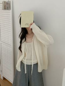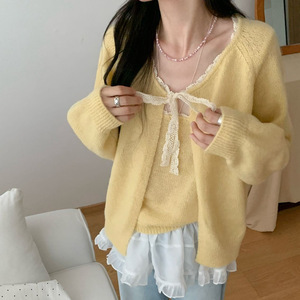 韩版百搭纯色长袖针织开衫女春秋季新款叠穿蕾丝花边毛衣吊带套装