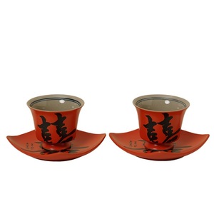 ★☆珊瑚红-新婚大喜高脚茶杯+杯垫两套★☆