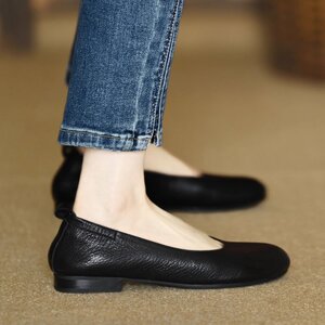 法式风软皮圆头平底单鞋女2025新款舒适软底一脚蹬低跟浅口妈妈鞋