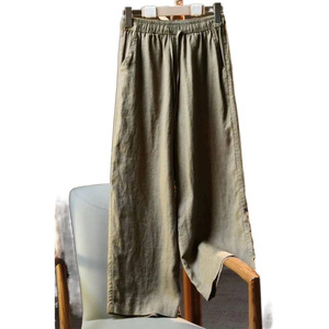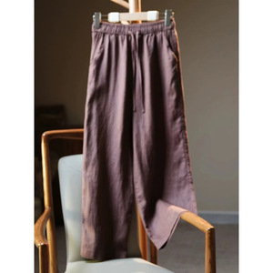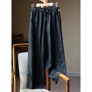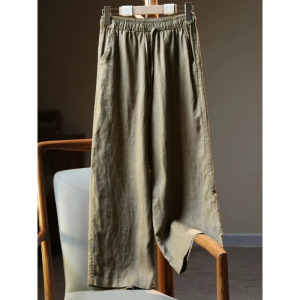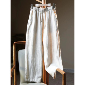 文艺复古2025新款棉麻阔腿裤女夏高腰松紧腰透气直筒裤百搭九分裤