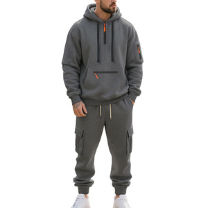跨境亚马逊秋冬季美式重磅加绒宽松男士休闲运动多口袋工装套装男