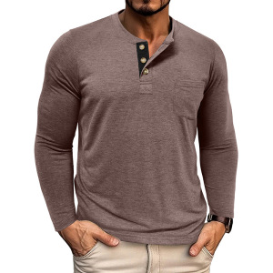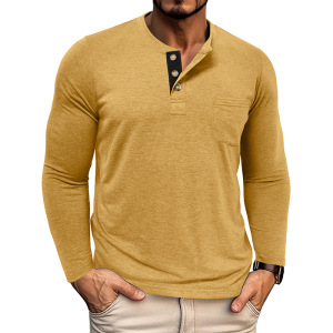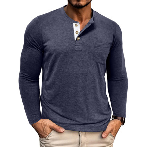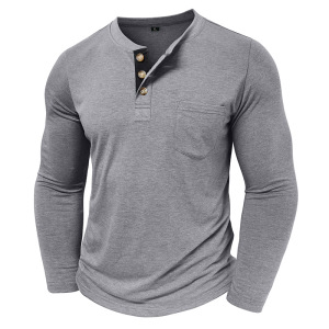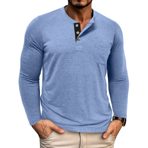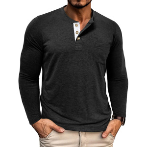 新款跨境欧美男装长袖t恤针织衫 亚马逊男士拼色三粒扣亨利衫批发