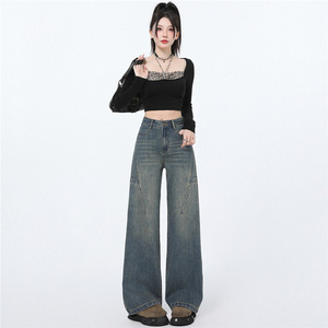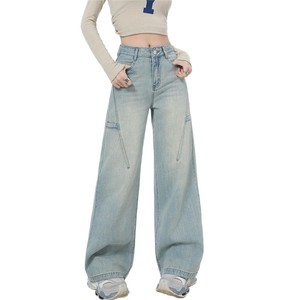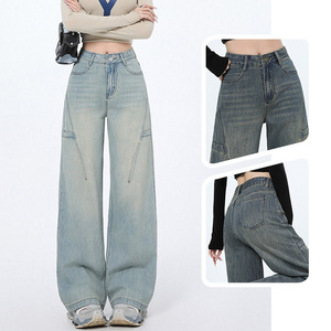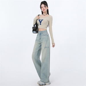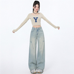 浅蓝色窄版阔腿牛仔裤女春秋2025新款高腰垂感宽松设计感直筒裤子