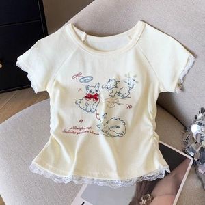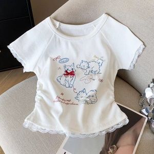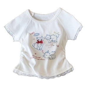 甜美风可爱小猫蕾丝短袖T恤女夏季纯欲修身显瘦时尚短款上衣chic
