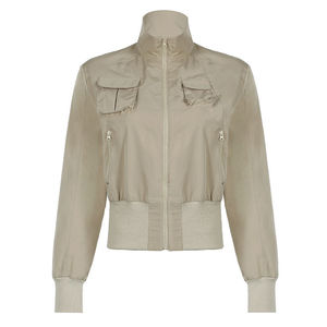 美式工装口袋收腰连帽夹克女外贸新款拉链半开领修身显瘦休闲外套