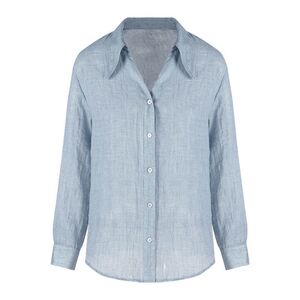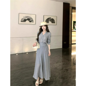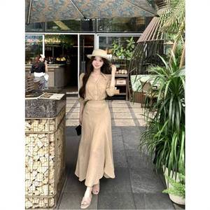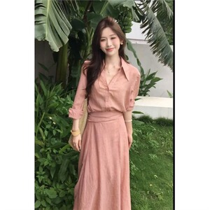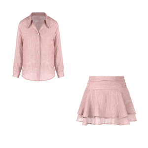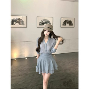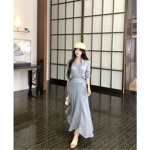 大码胖mm夏季新款复古V领长袖衬衫+高腰A字半身裙气质显瘦两件套