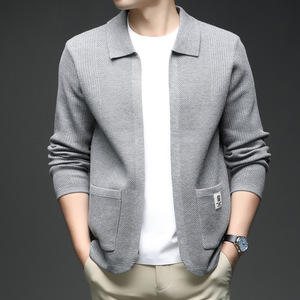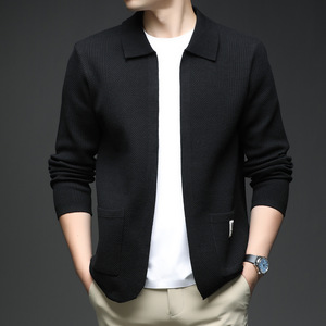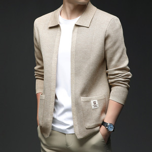 2025秋季男士针织衫开衫时尚外套休闲翻领口袋上衣无扣贴布针织衫